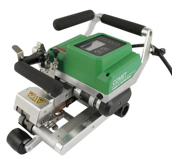 Leister COMET 500: Máquina automática para soldadura de geomembranas de PEAD, con velocidad de soldadura de hasta 8 m/min, pantalla digital y control de presión de soldadura. Sepa más
