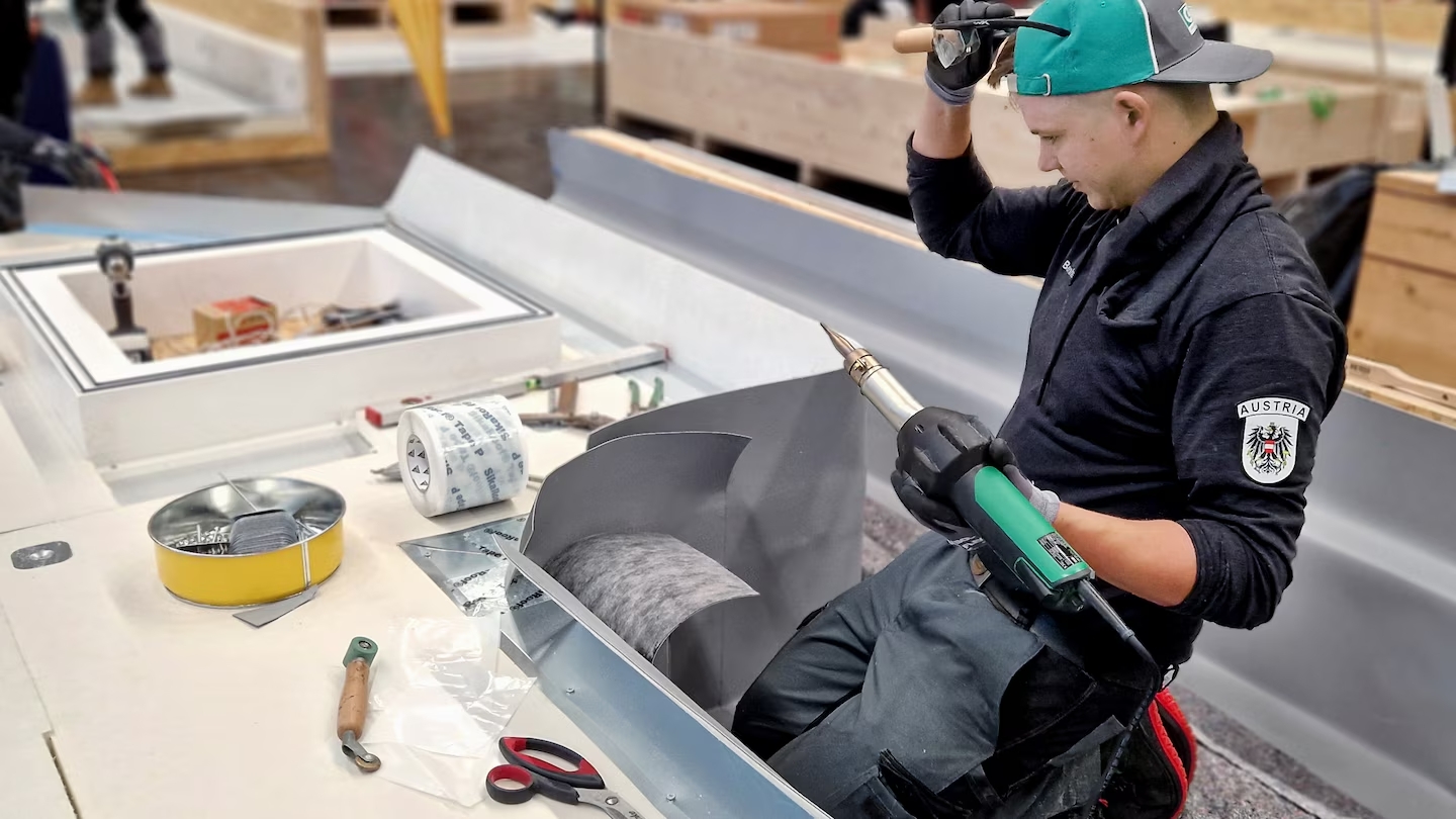 En las disciplinas de fachada, techo plano, techo inclinado y techo metálico, jóvenes profesionales de todo el mundo compitieron para demostrar sus habilidades. El punto culminante fue la reñida competencia entre los equipos de Austria, Suiza y China en la categoría de techo plano.