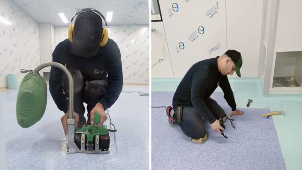 En la imagen de la izquierda, se puede ver a un instalador de pisos de FS DECO fresando juntas en un piso de linóleo con la GROOVER.