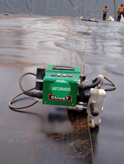 - Máquina automática de soldadura por cuña caliente Leister COMET, para soldar geomembranas PEAD de manera confiable.