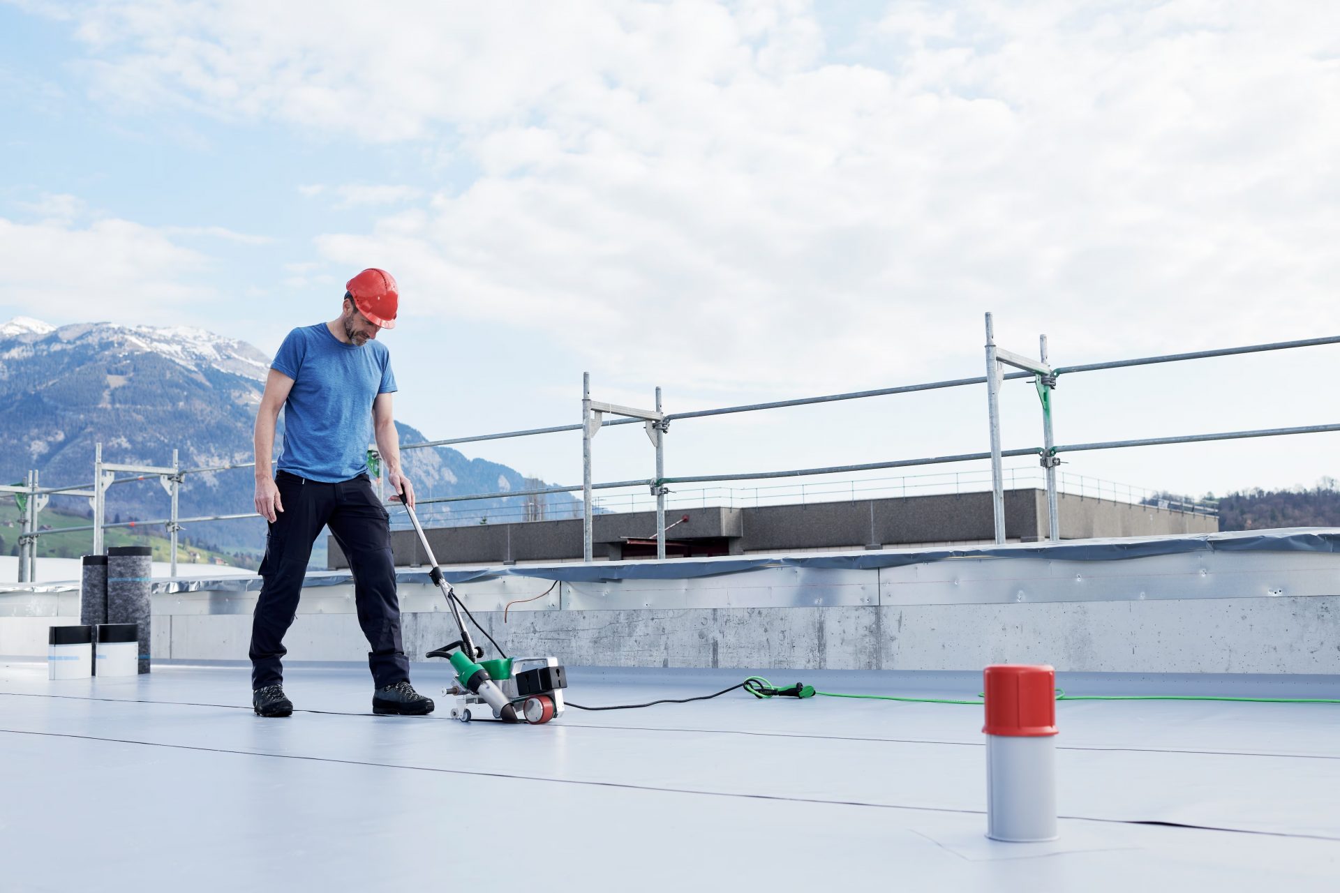 Instalador arrodillado utilizando la soldadora semiautomática Leister UNIDRIVE 500 para unir membranas en la impermeabilización de un techo plano