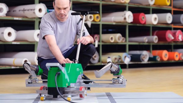 Operación de Leister SEAMTEK W-900 AT en la fabricación de productos de gran formato, logrando soldaduras precisas para lonas, cortinas tensionadas y estructuras inflables