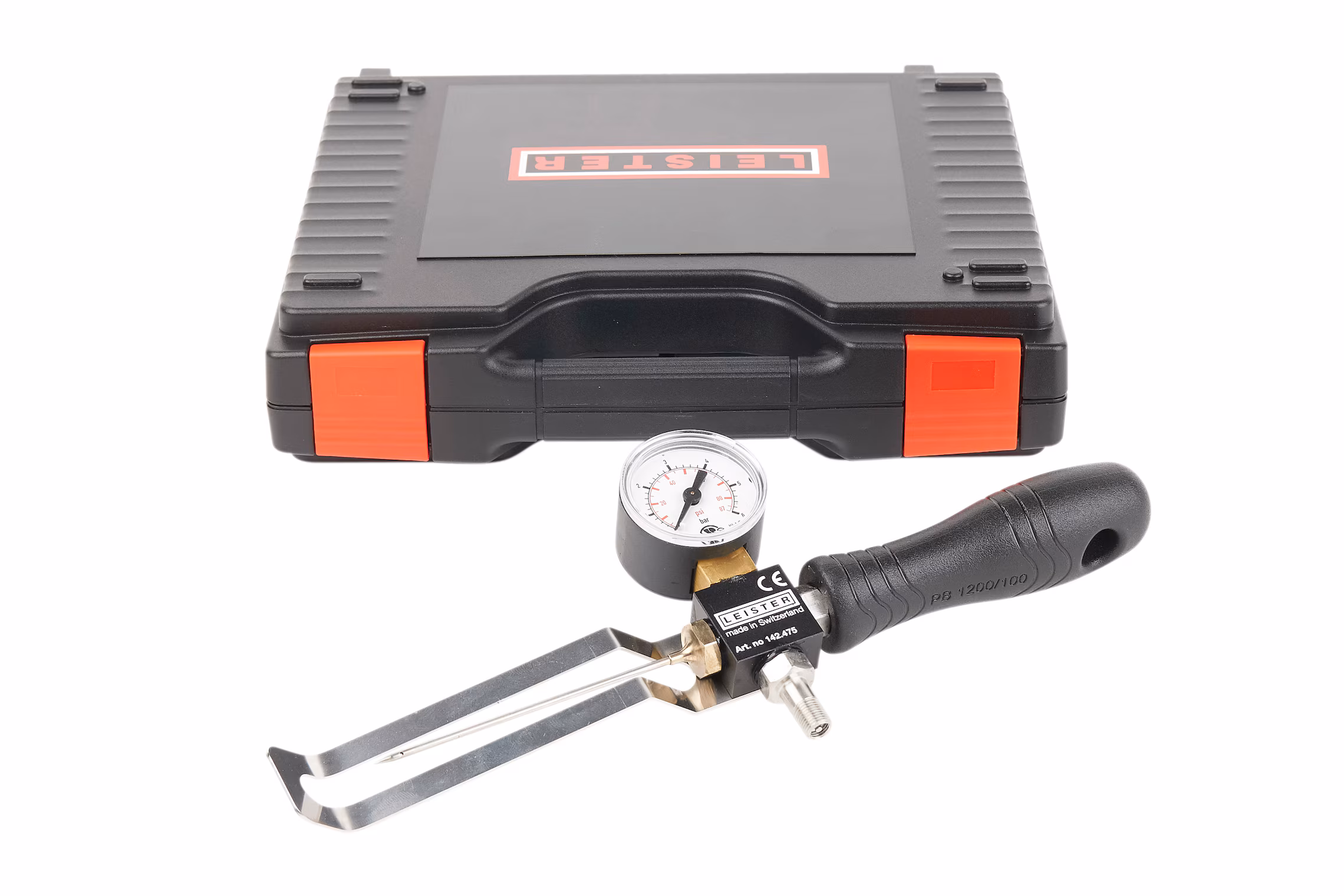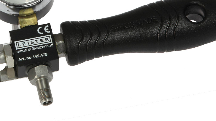 Con manómetro integrado de 0 a 6 bar, la Aguja de Pruebas Fina Leister permite inyectar aire en el canal de ensayo de soldaduras dobles para verificar rápidamente fallas o fugas, siendo recomendada para mantas delgadas de PEAD de hasta 1 mm y para mantas de PVC.