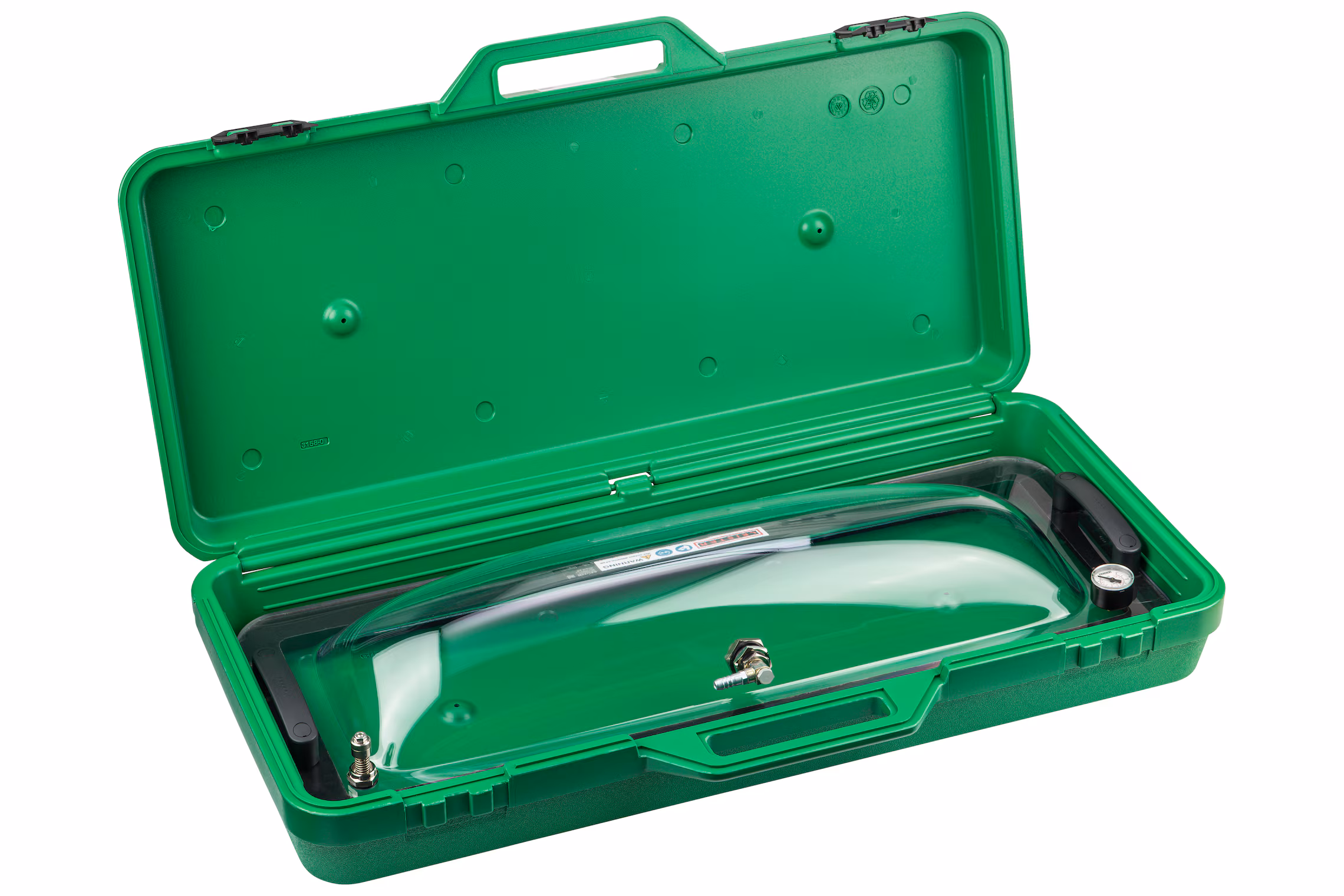 Diseñada para el uso en obra, la caja de vacío es altamente resistente a impactos y cuenta con un sello de goma duradero que se adapta correctamente a superficies irregulares. Esto asegura un vacío constante y resultados de prueba confiables en distintas condiciones.