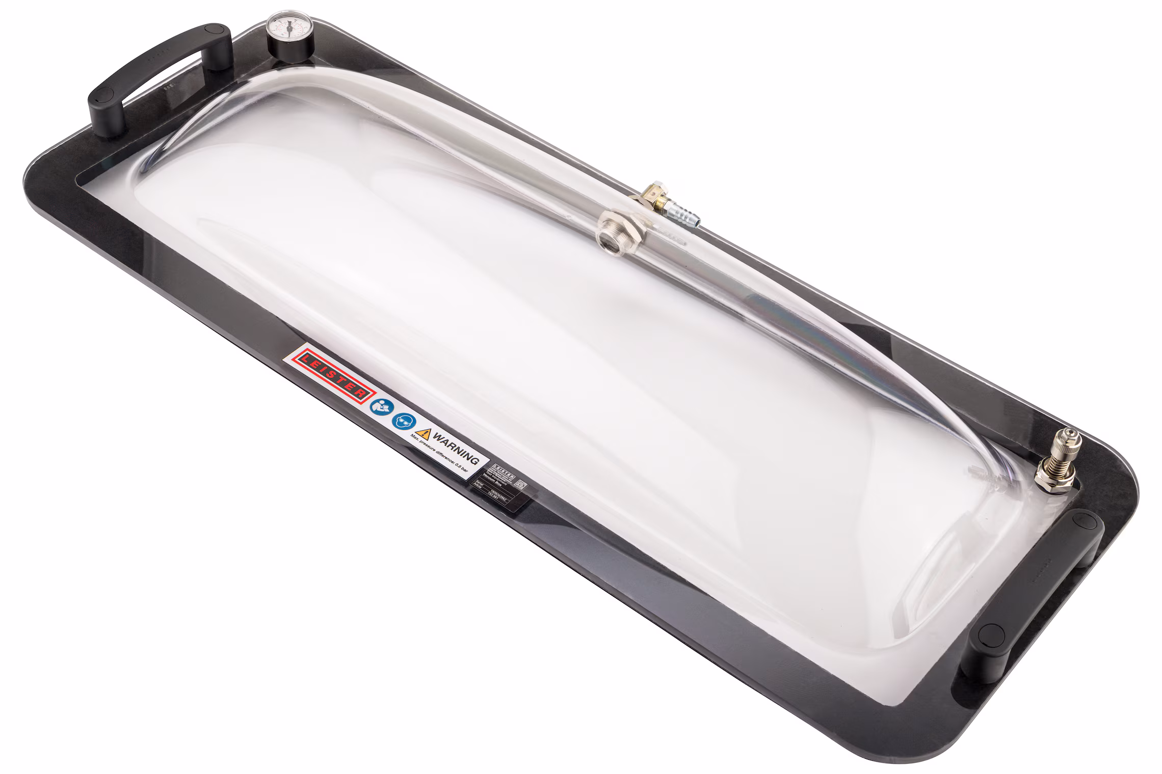 Con un área de prueba amplia de 810 x 310 mm, es posible verificar secciones grandes de soldadura en una sola pasada, aumentando la eficiencia y la productividad. El manómetro integrado con doble escala (bar/PSI) permite un monitoreo simple y preciso de la presión de vacío durante la prueba.