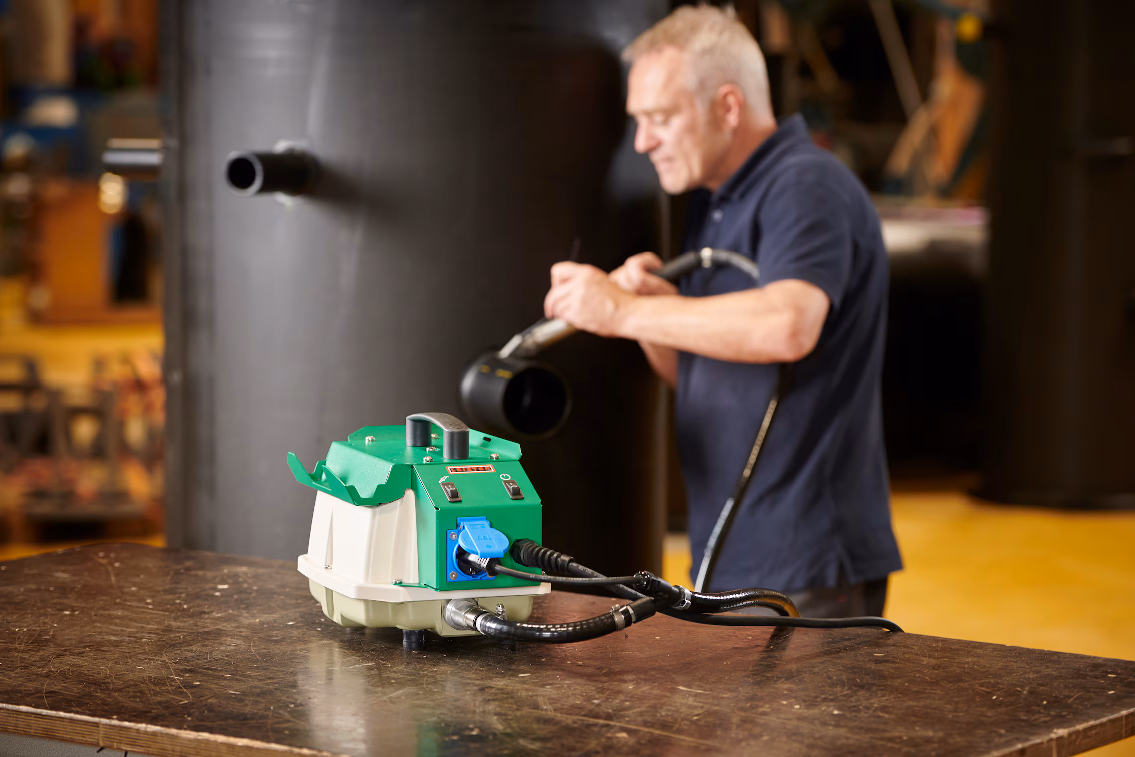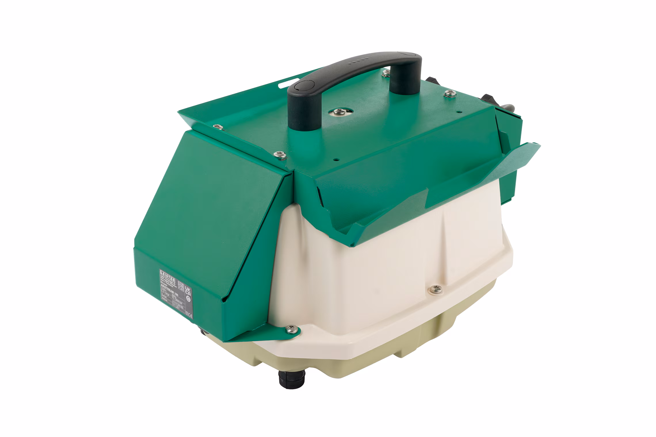Fuente de aire compacta para herramientas de aire caliente Leister, desarrollada para generar aire limpio y filtrado con funcionamiento silencioso y diseño portátil. Ofrece bajo mantenimiento, larga vida útil, interruptor independiente para facilitar el manejo de la herramienta y almacenamiento seguro gracias al soporte integrado.