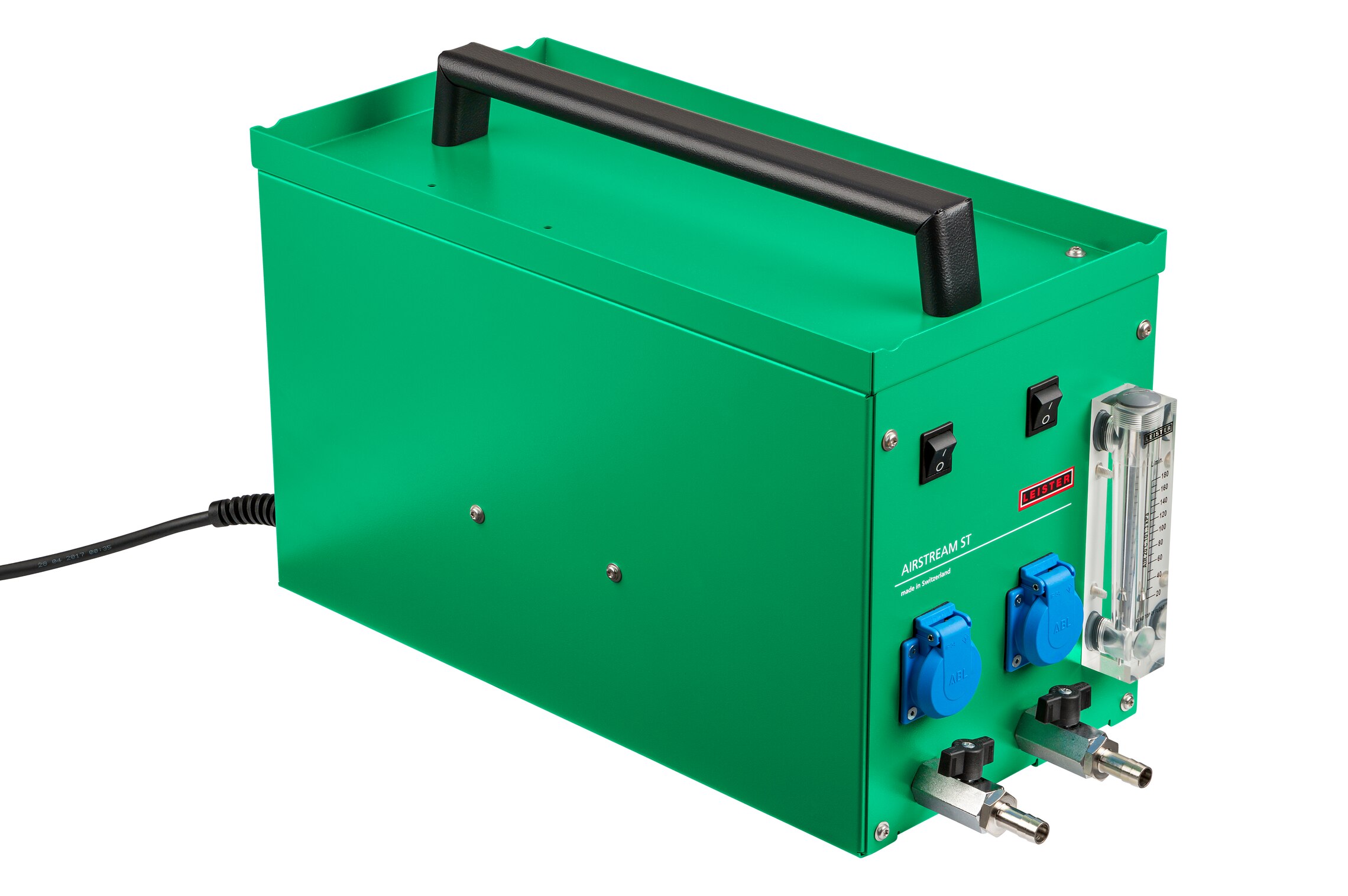 Leister AIRSTREAM ST es una fuente de aire silenciosa y eficiente diseñada para alimentar herramientas de aire caliente Leister, como LABOR, PENWELD y DIODE. Es ideal para profesionales que trabajan en entornos industriales y de laboratorio que necesitan un flujo de aire estable y silencioso para soldadura y retracción de plásticos.