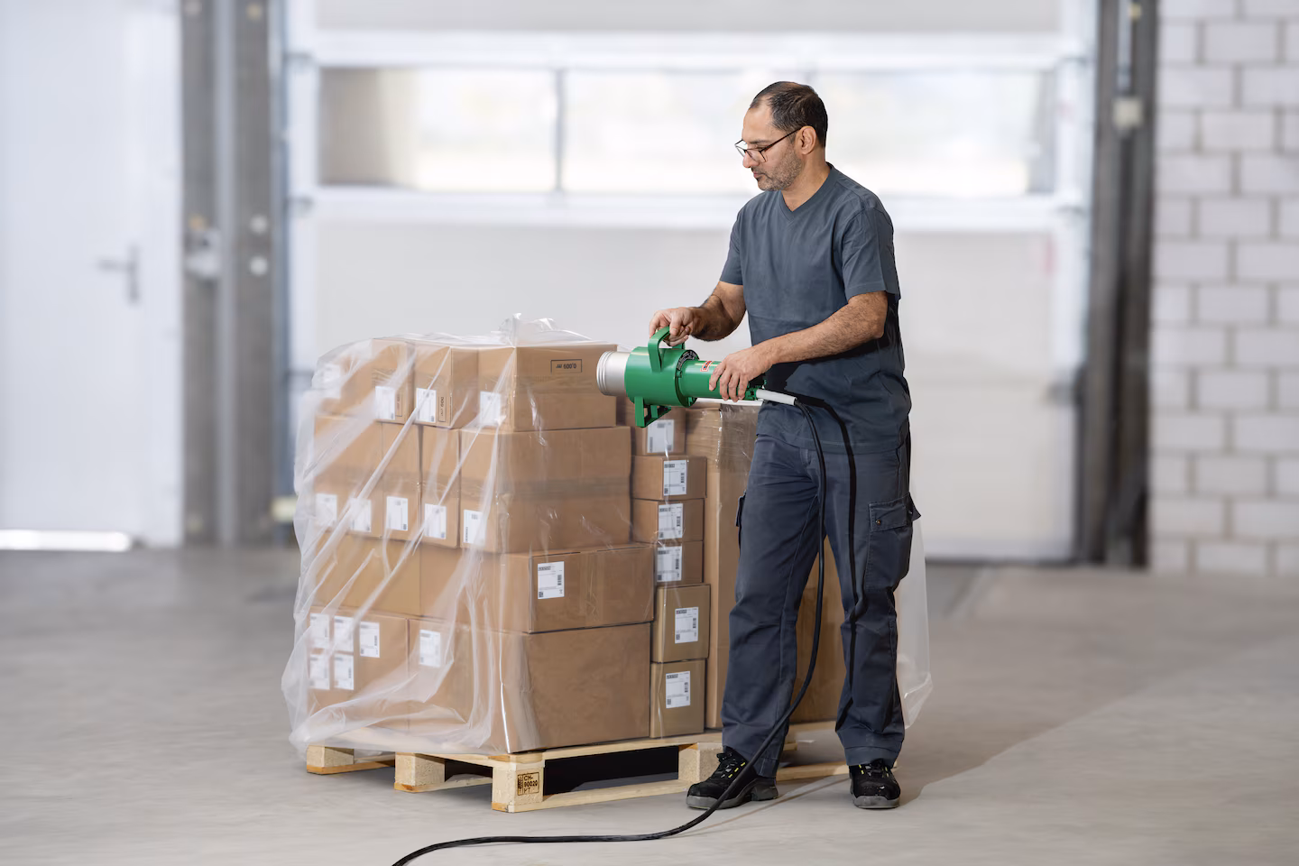 - Termoencogimiento de films plásticos en palets para transporte seguro.