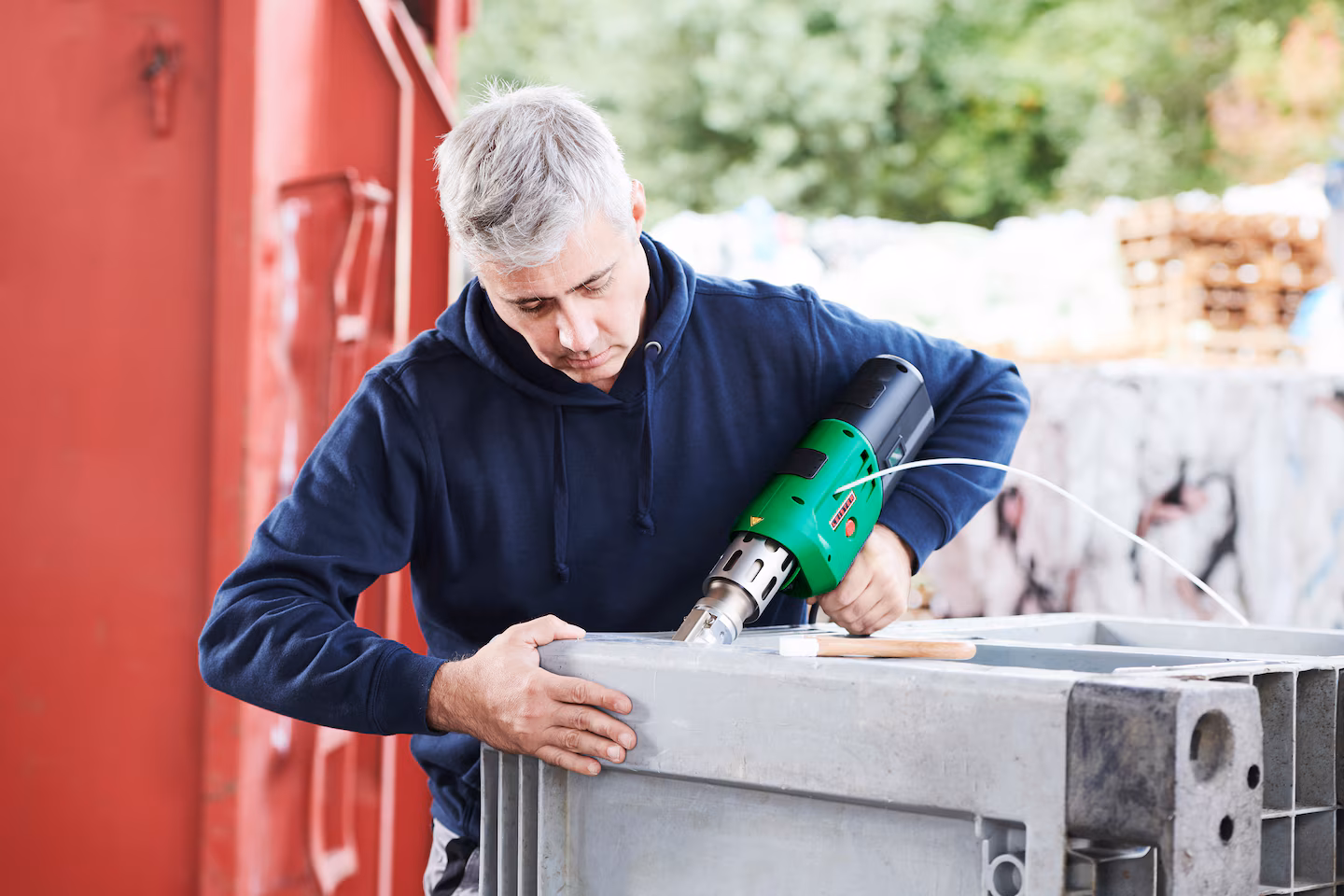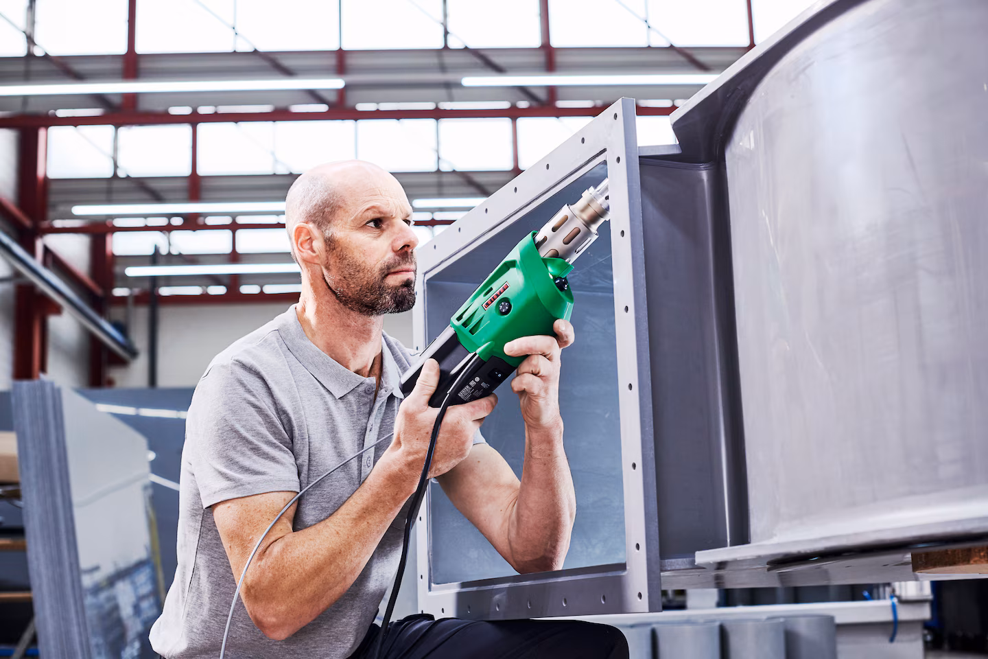 La Leister FUSION 1 está diseñada para trabajos de reparación y fabricación en plásticos técnicos, especialmente donde se requiere una extrusora compacta y maniobrable: