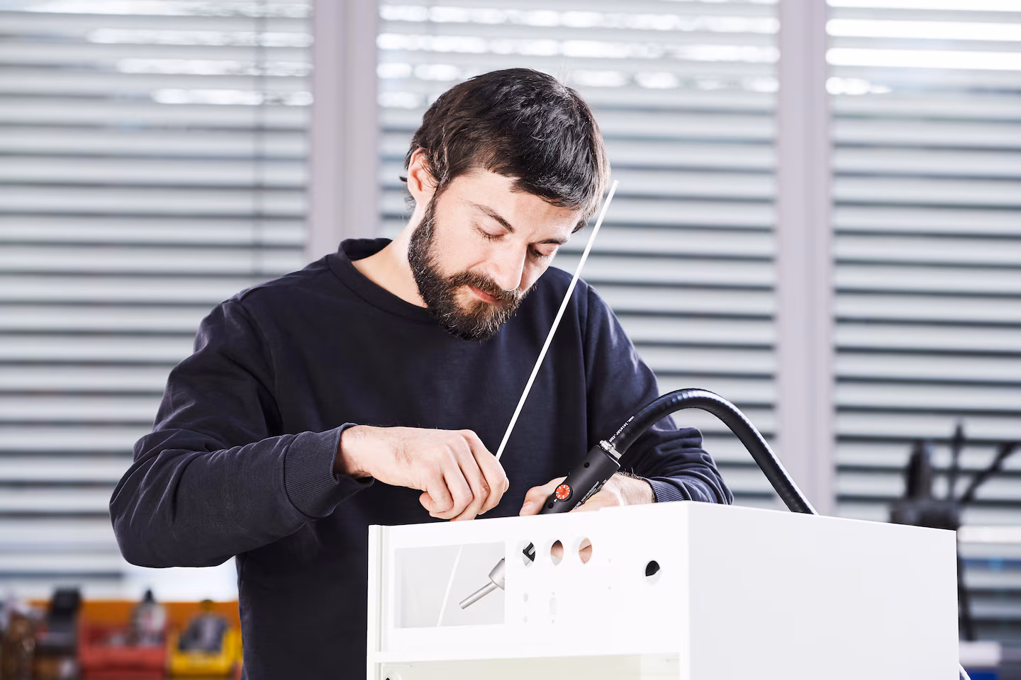Gracias a su diseño compacto, el LABOR S es ideal para aplicaciones de soldadura y termoencogimiento en espacios confinados, así como para procesos delicados como la restauración de obras de arte, antigüedades y componentes técnicos sensibles. Su control de temperatura se realiza mediante un botón giratorio de fácil acceso, que permite ajustes rápidos incluso al usar guantes.