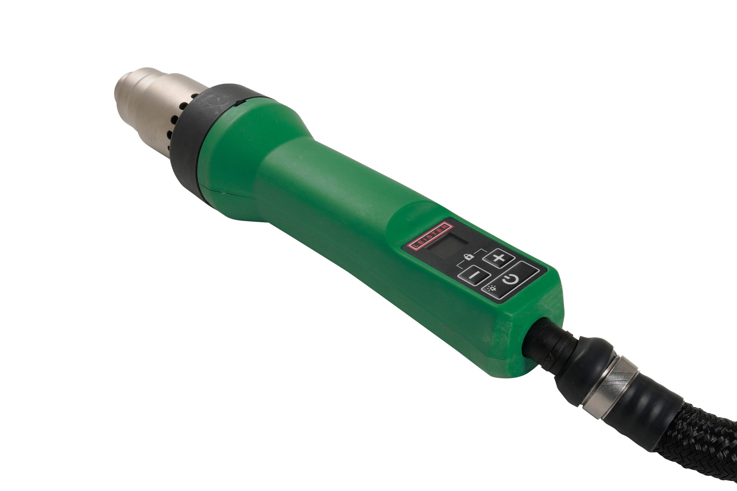El display digital muestra en todo momento la temperatura configurada y la real, garantizando un control exacto del calor. Gracias al control electrónico de aire caliente, el PENWELD A mantiene la temperatura constante, lo que asegura soldaduras homogéneas en materiales sensibles como PVC rígido y flexible.