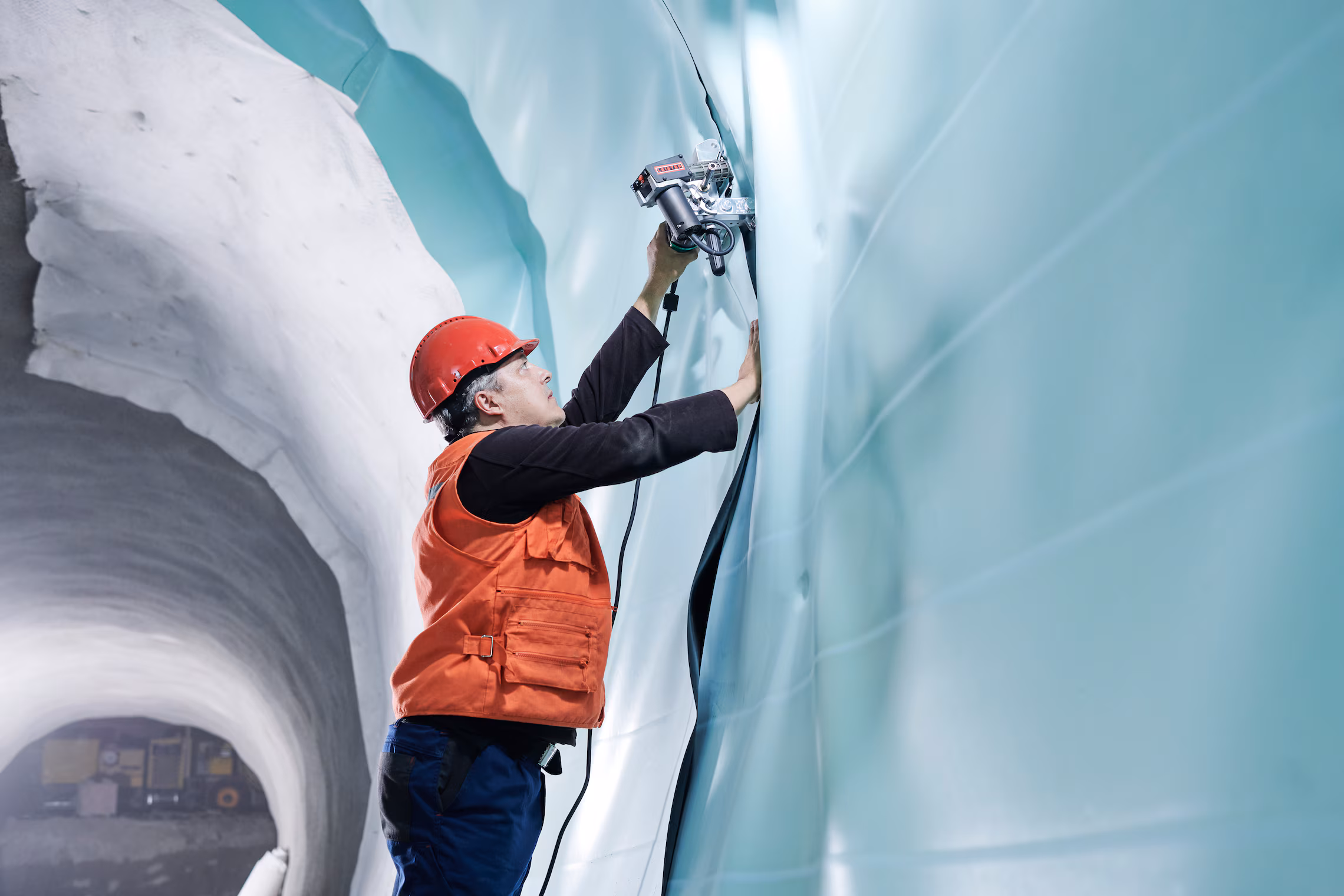 La Leister TWINNY S con versión de cuña combinada está optimizada para soldadura por encima de la cabeza en construcción de túneles. Soldar membranas delgadas y liners se vuelve sencillo con esta máquina de soldadura liviana.