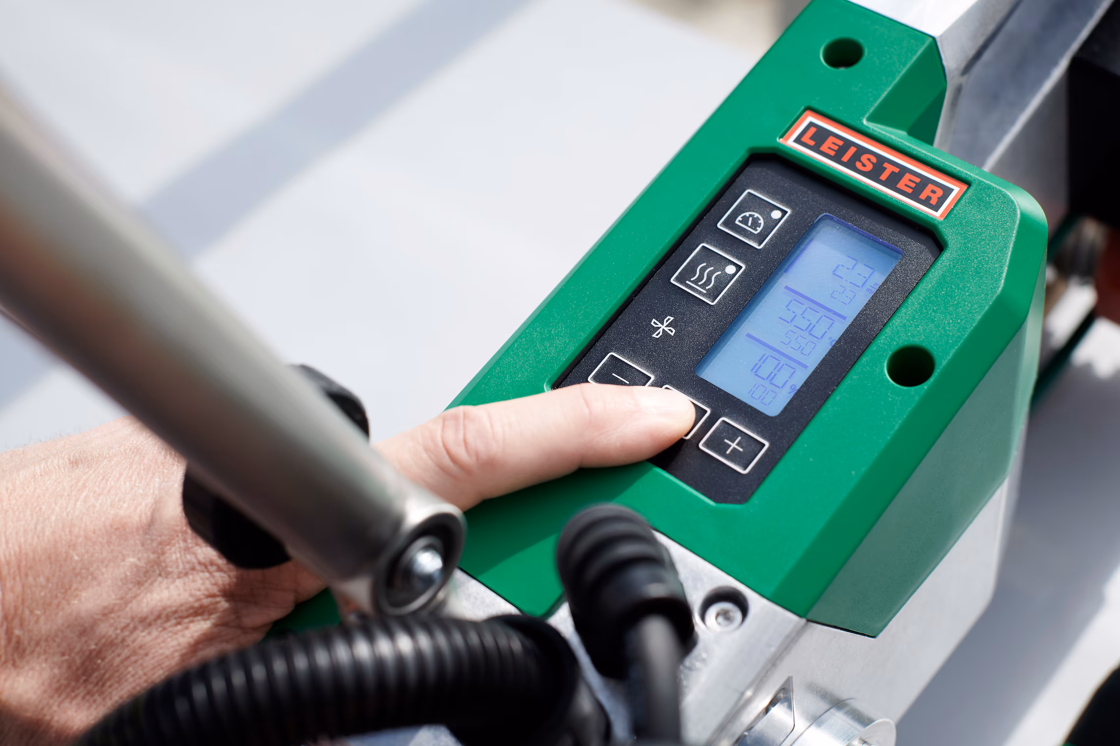 La tecnología de control en lazo cerrado de Leister y el display digital brindan retroalimentación en tiempo real, facilitando el ajuste y el monitoreo de los parámetros de soldadura de las membranas (velocidad, volumen y temperatura del aire). Esto garantiza soldaduras perfectas en membranas plásticas.