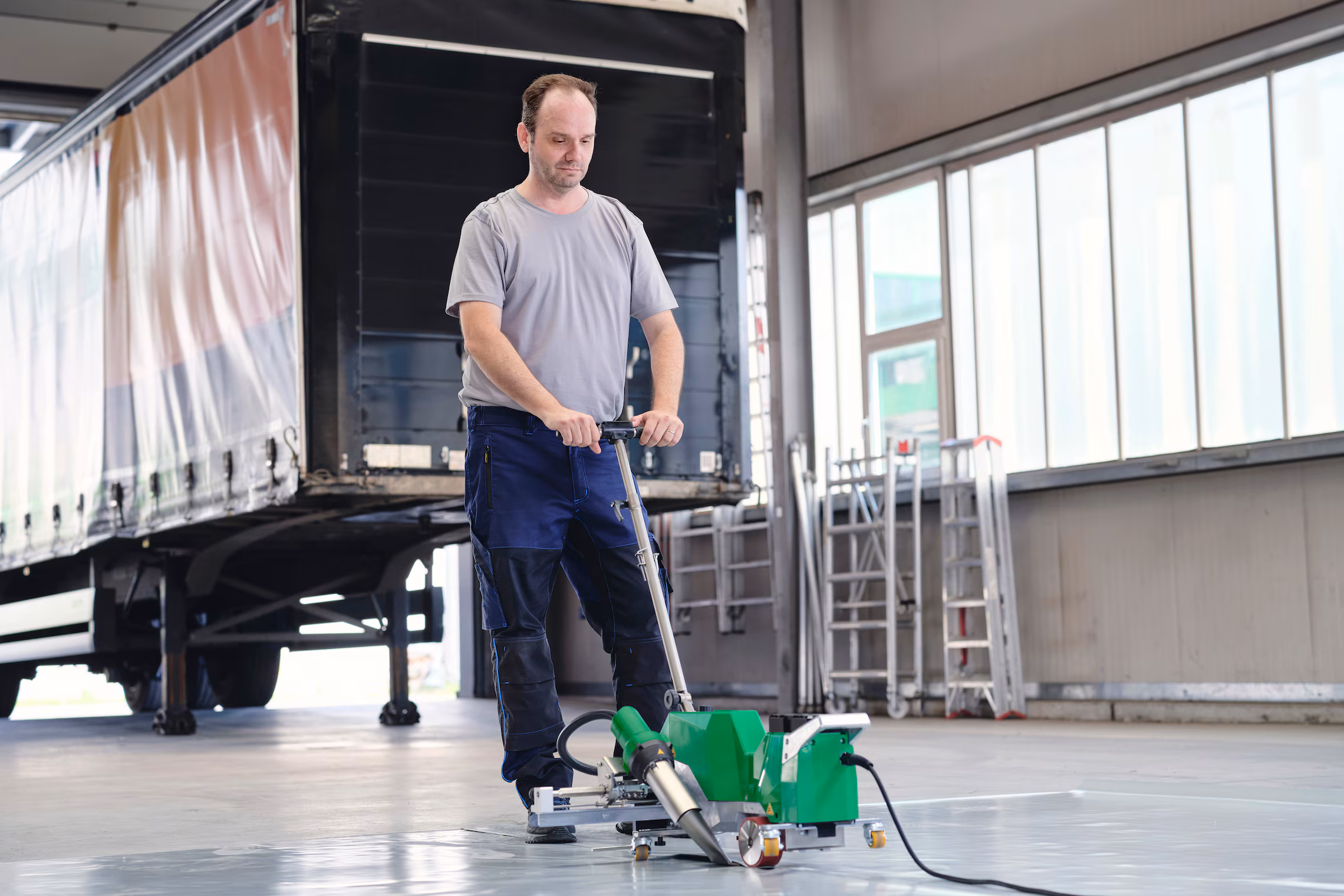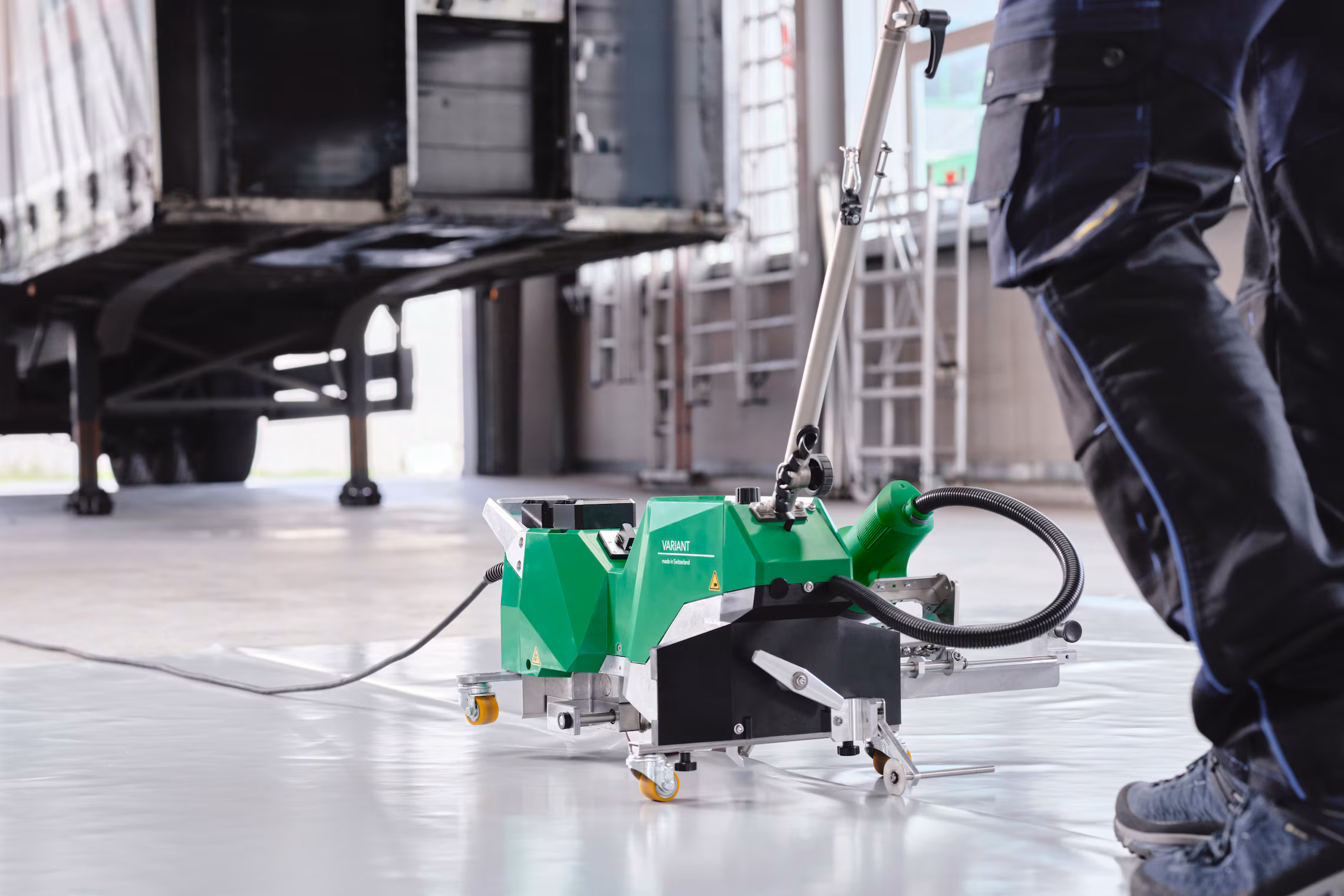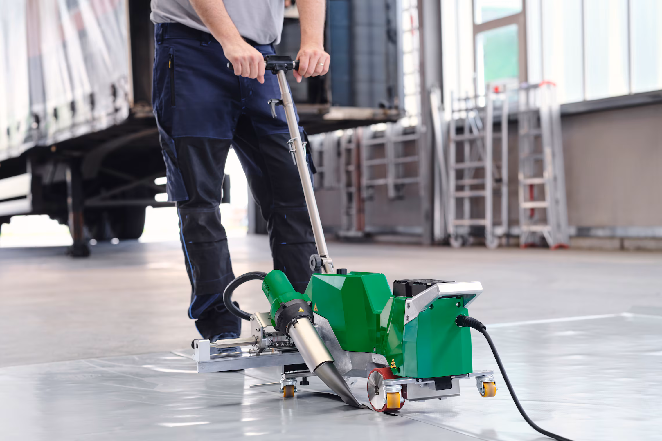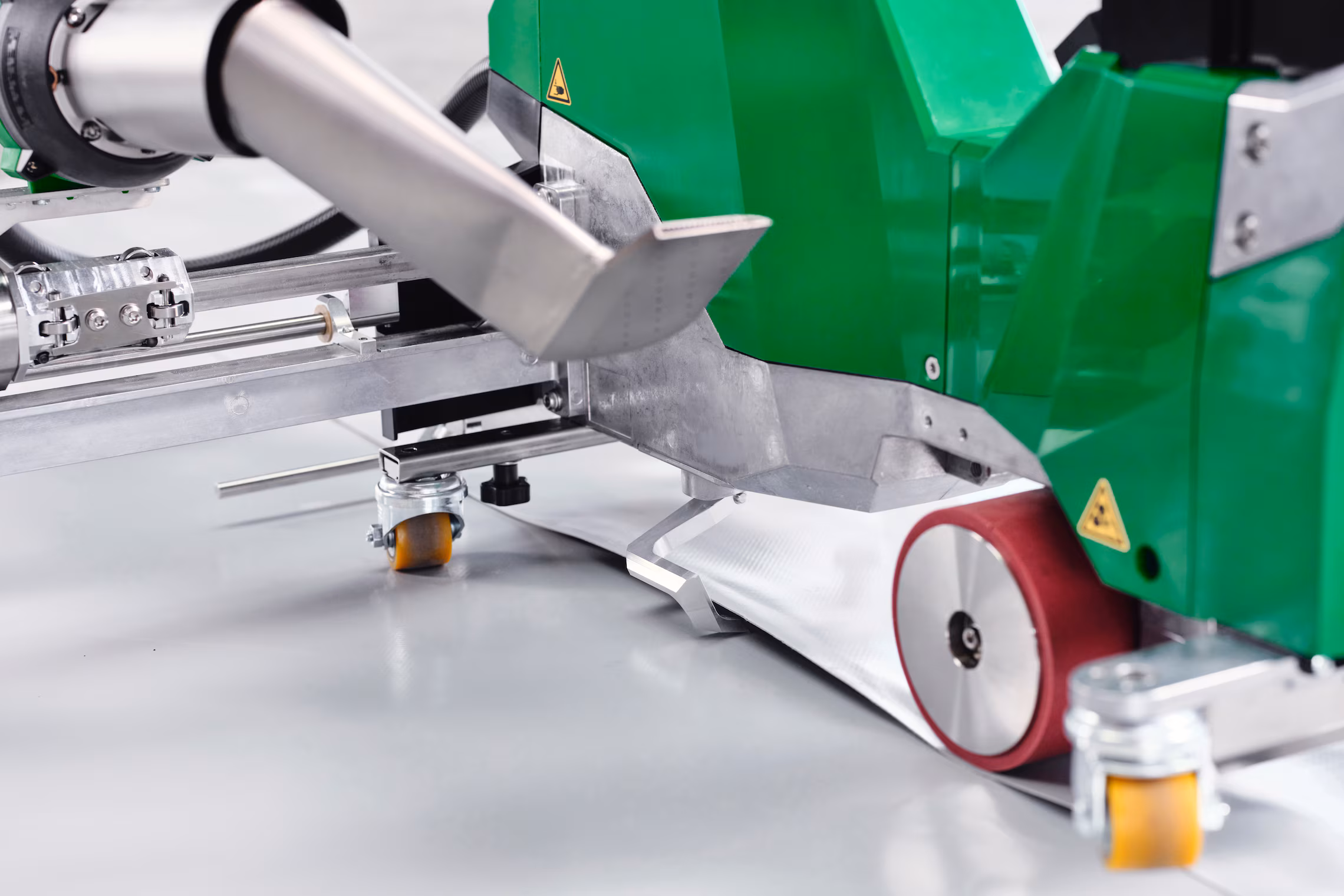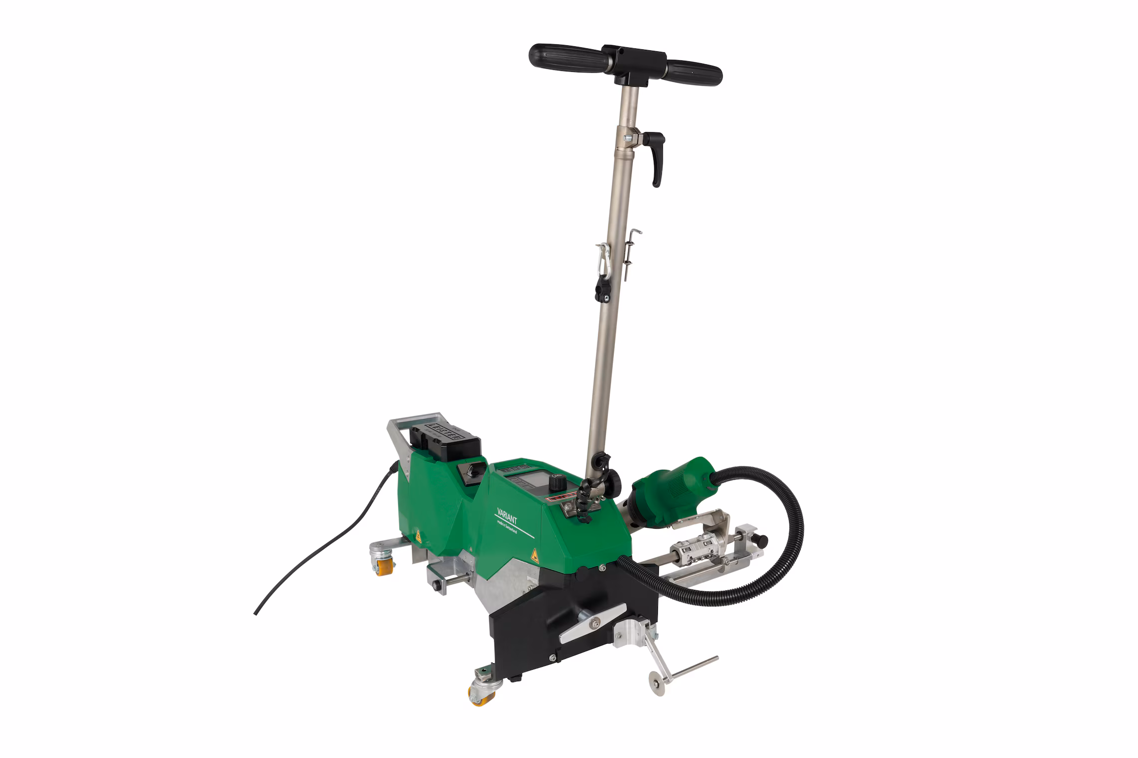 La Leister VARIANT 700 está diseñada para operación segura de pie, asegurando condiciones de trabajo eficientes y seguras para tareas de soldadura por solape.