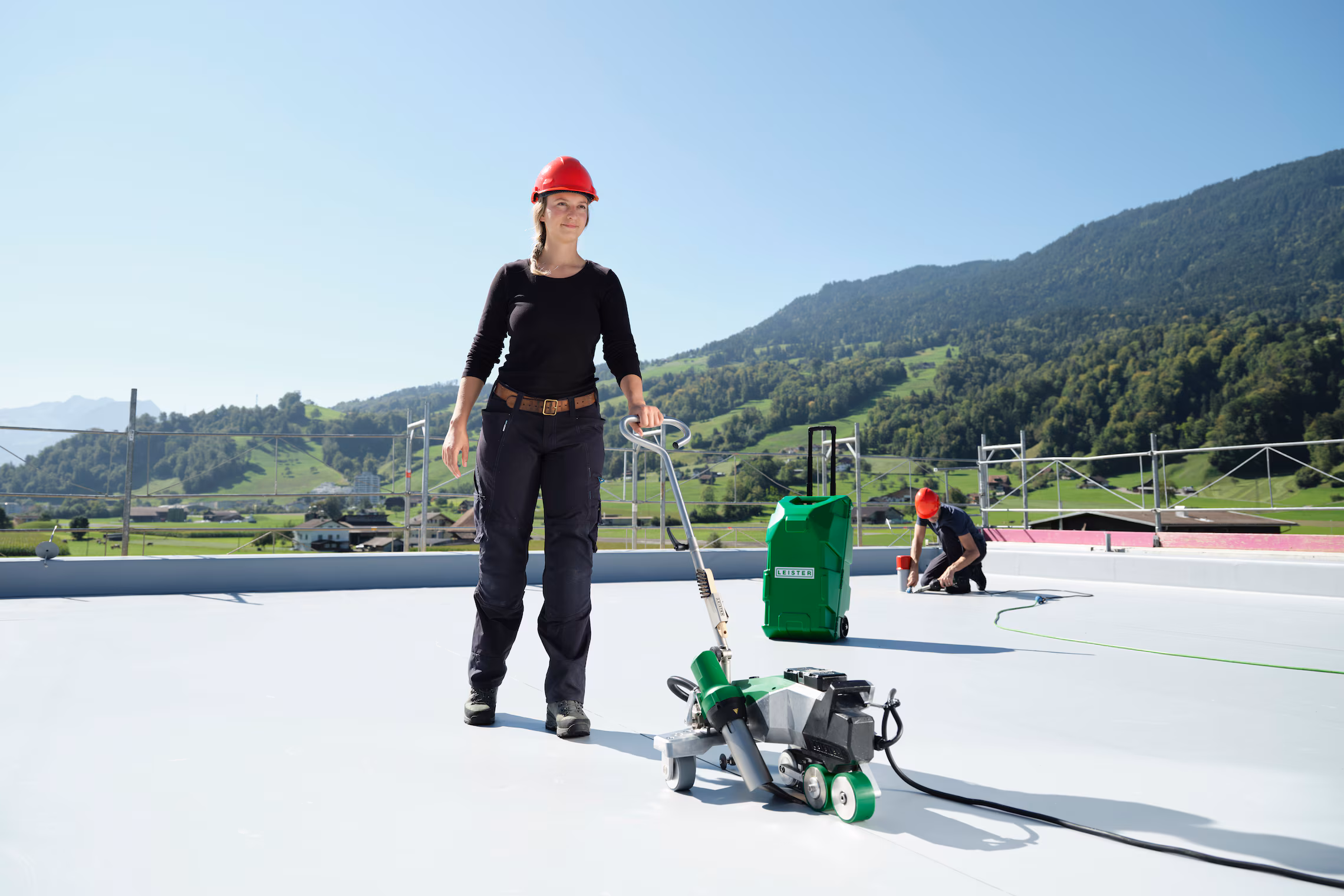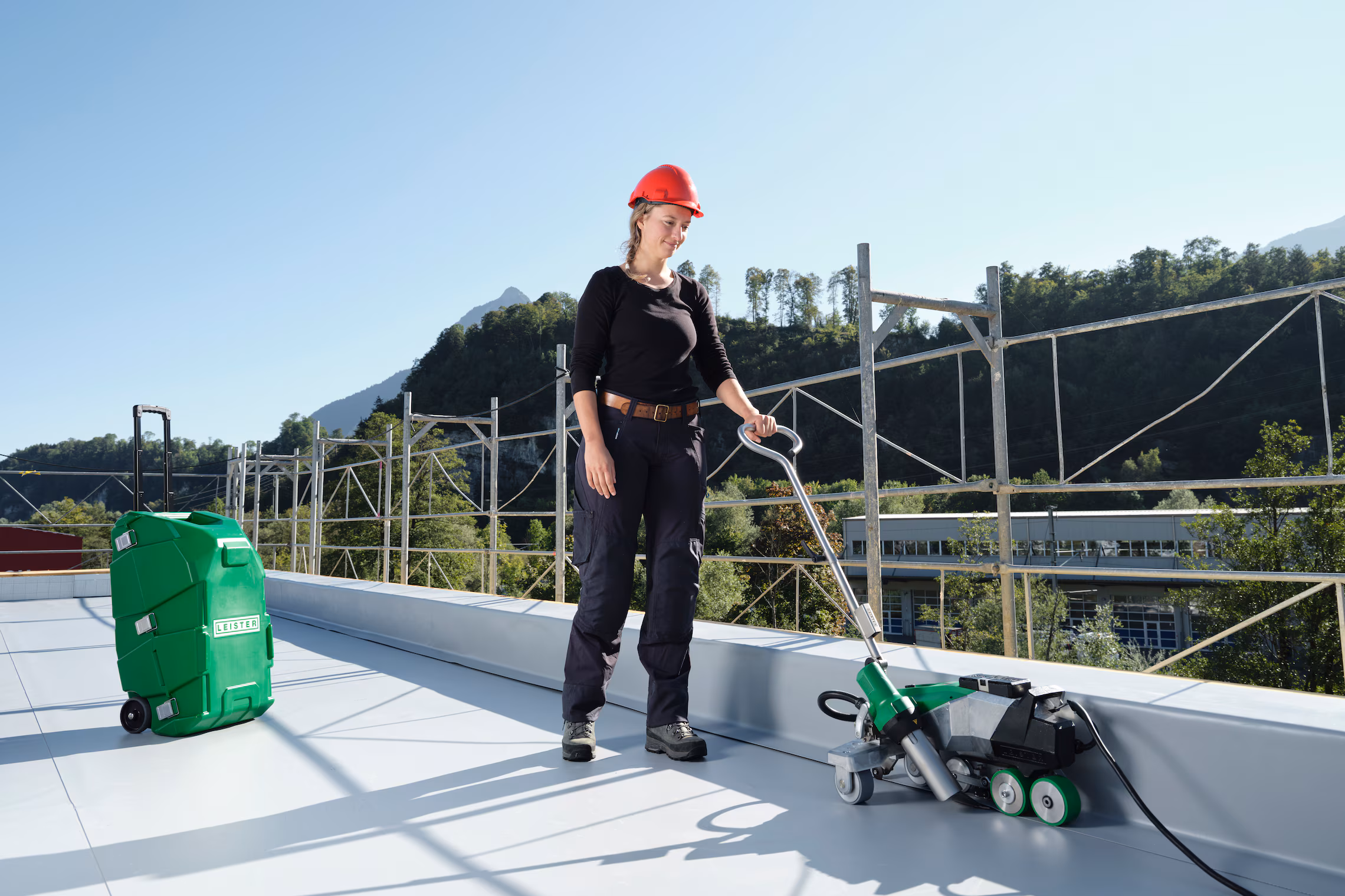 El diseño triangular equilibrado y el eje de transporte deslizante de Leister VARIMAT 700 garantizan precisión de seguimiento y flexibilidad durante el sellado de cubiertas.