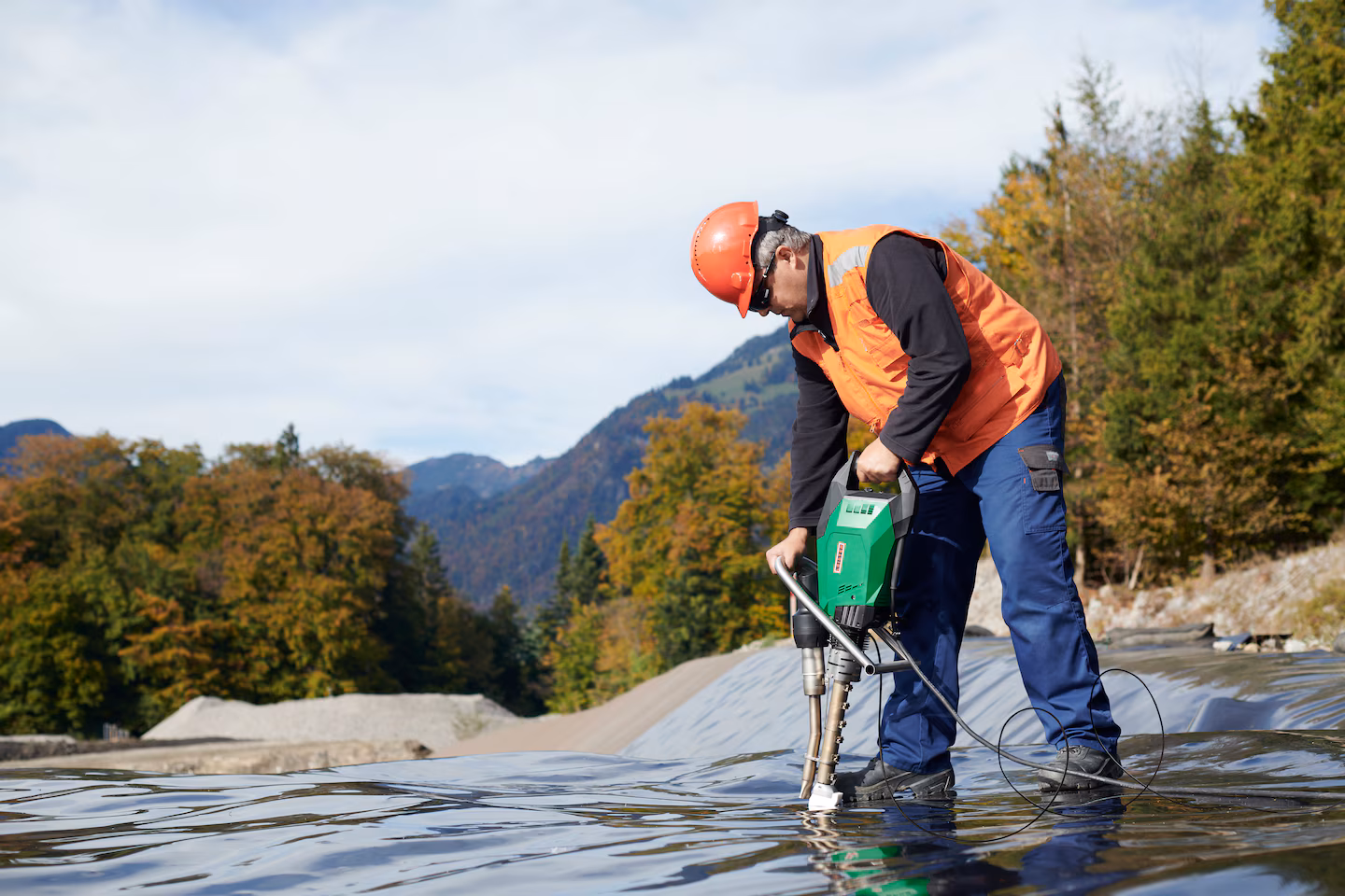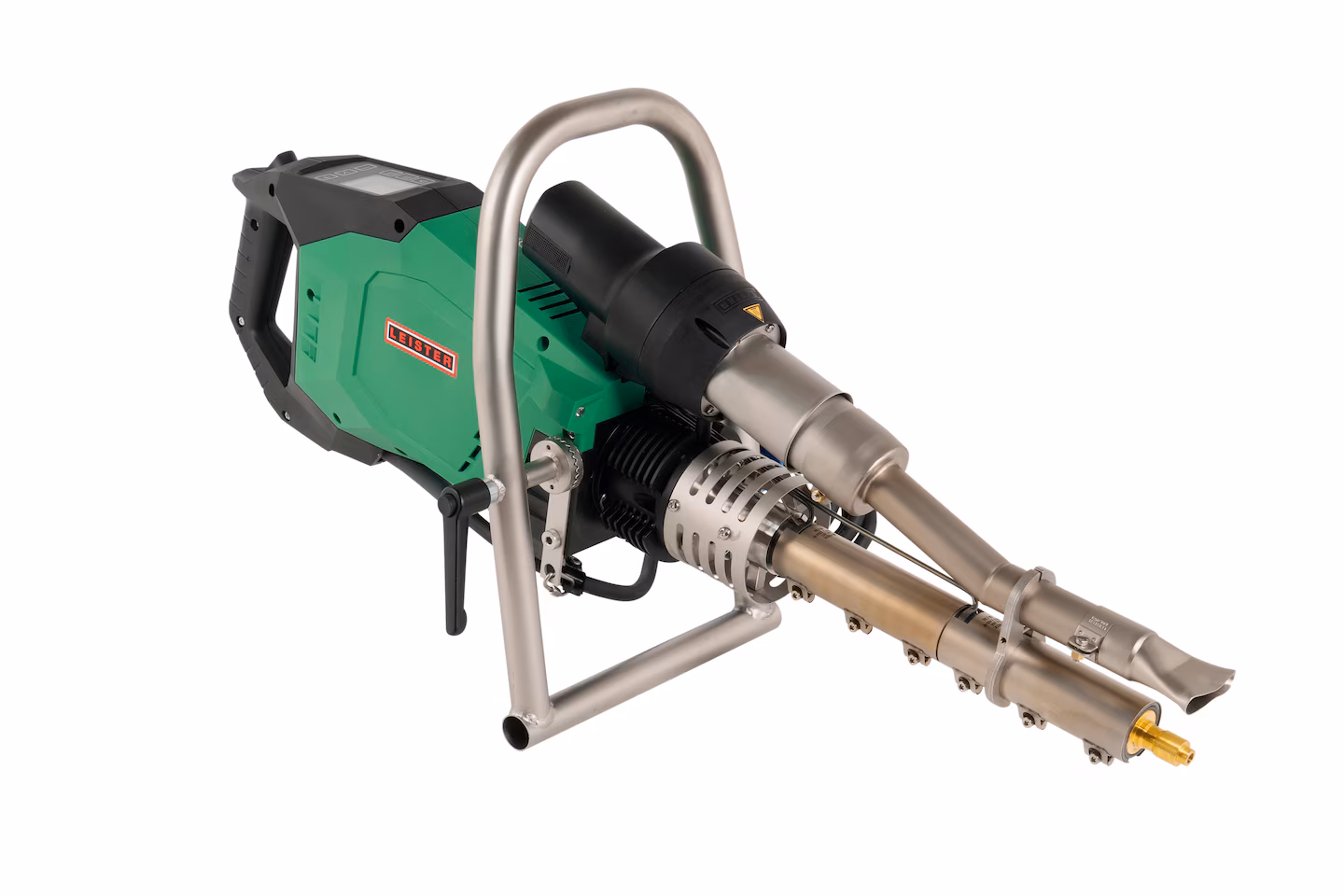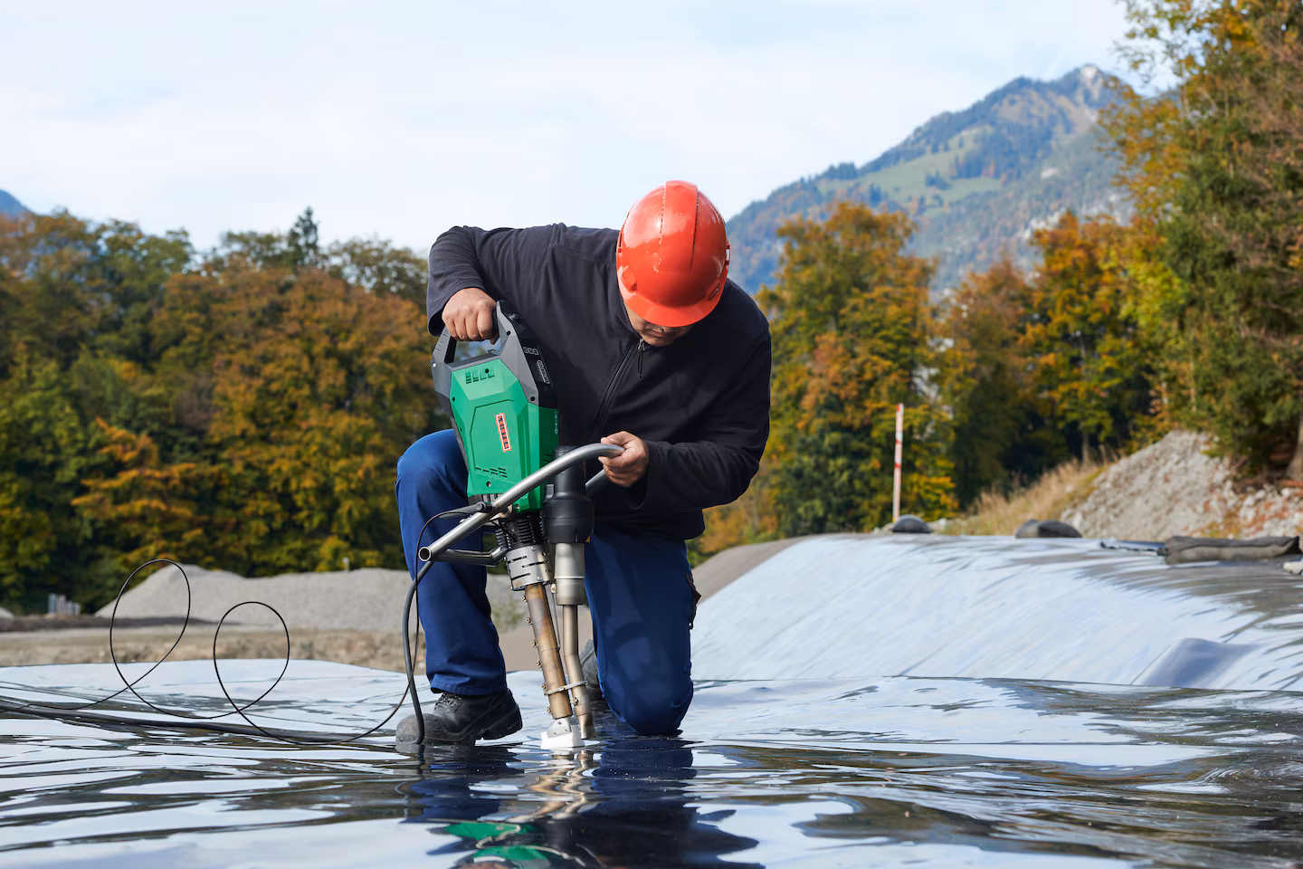 La Leister WELDPLAST 605 es la extrusora manual de referencia para geomembranas PE en obra civil: une alto caudal (hasta 6 kg/h), trazabilidad total (LQS + GPS), motores brushless, doble zona de calentamiento y diseño enfocado a terreno.