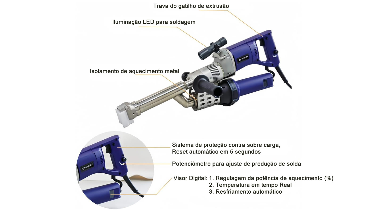 Con un volumen de extrusión de hasta 3,4 kg/h, esta extrusora destaca por su pantalla digital para control de temperatura, potenciómetro de ajuste de caudal y un LED integrado que ilumina directamente la zona de soldadura, ofreciendo máxima visibilidad incluso en condiciones de obra con baja luz.