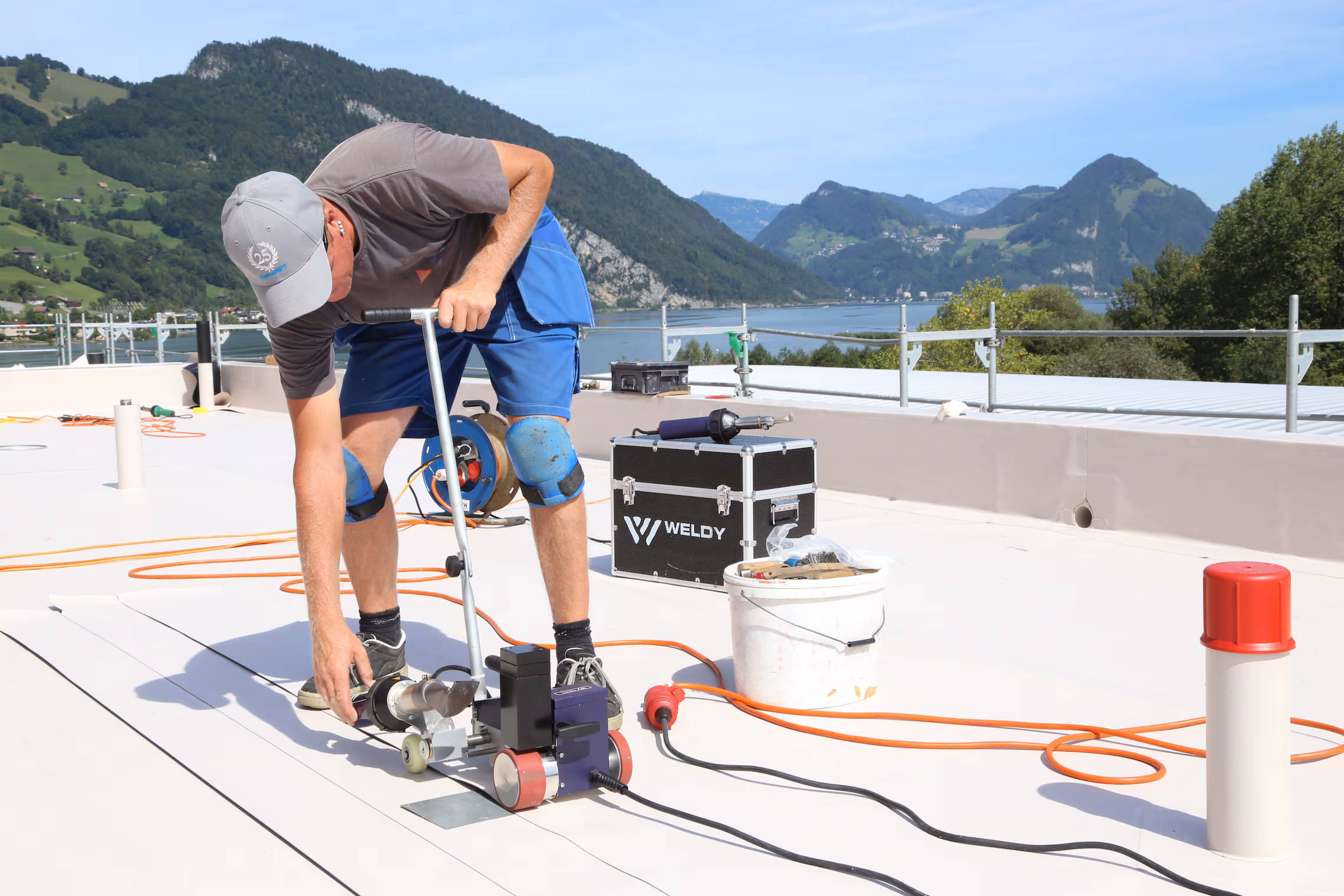 Weldy ROOFER RW3400 ofrece mayor potencia, con 3500 W, para soldadura de lonas más gruesas y con un ancho de soldadura de 40 mm. Está diseñada para trabajos que exigen alta velocidad, control y mejor desempeño en aplicaciones con materiales flexibles de mayor espesor.